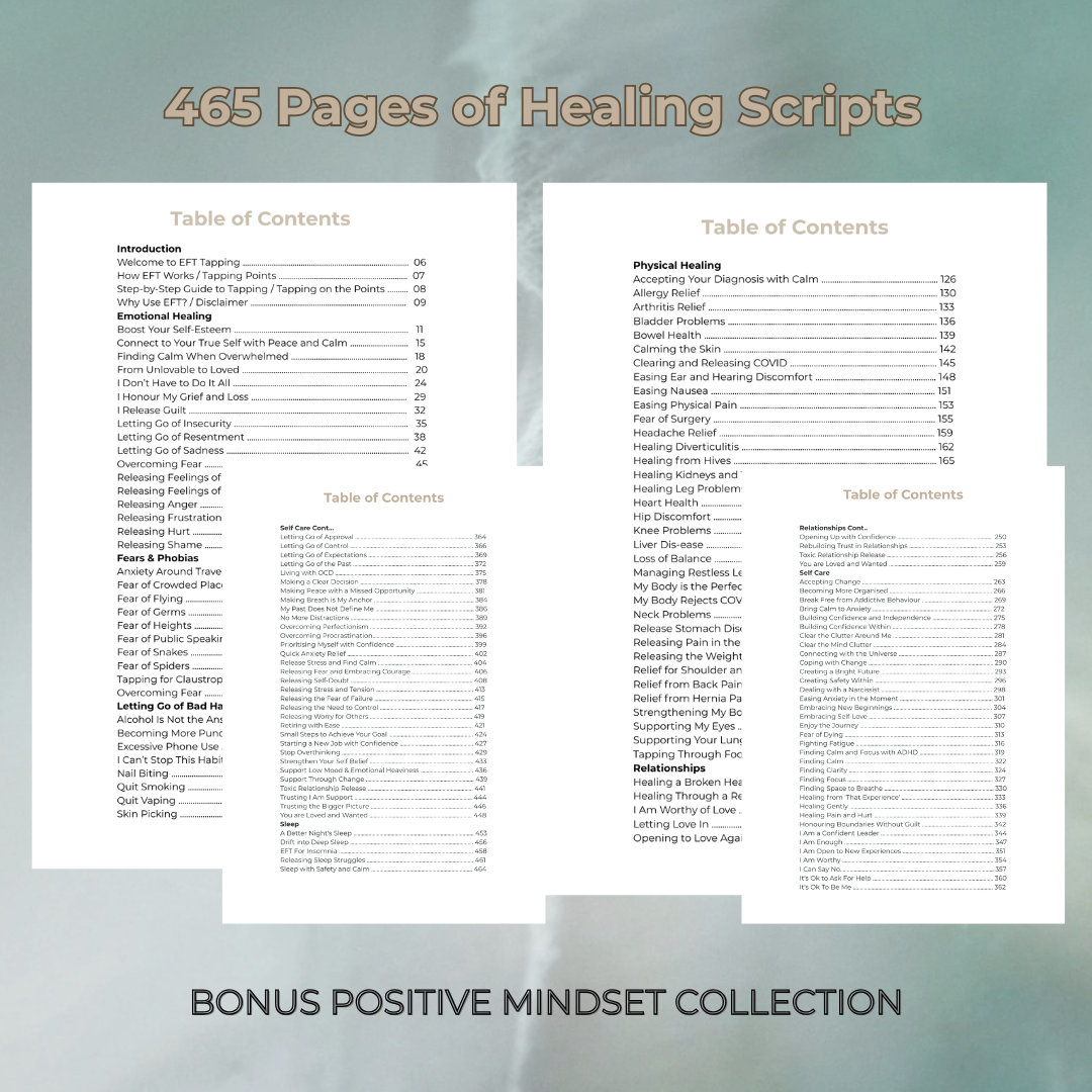 This Ultimate Tapping Script Collection – Healing Bundle is your personal, at-home emotional wellness toolkit—offering 465 pages of guided EFT (Emotional Freedom Technique) scripts crafted to help you clear emotional blocks, manage stress, and reconnect with calm and clarity.